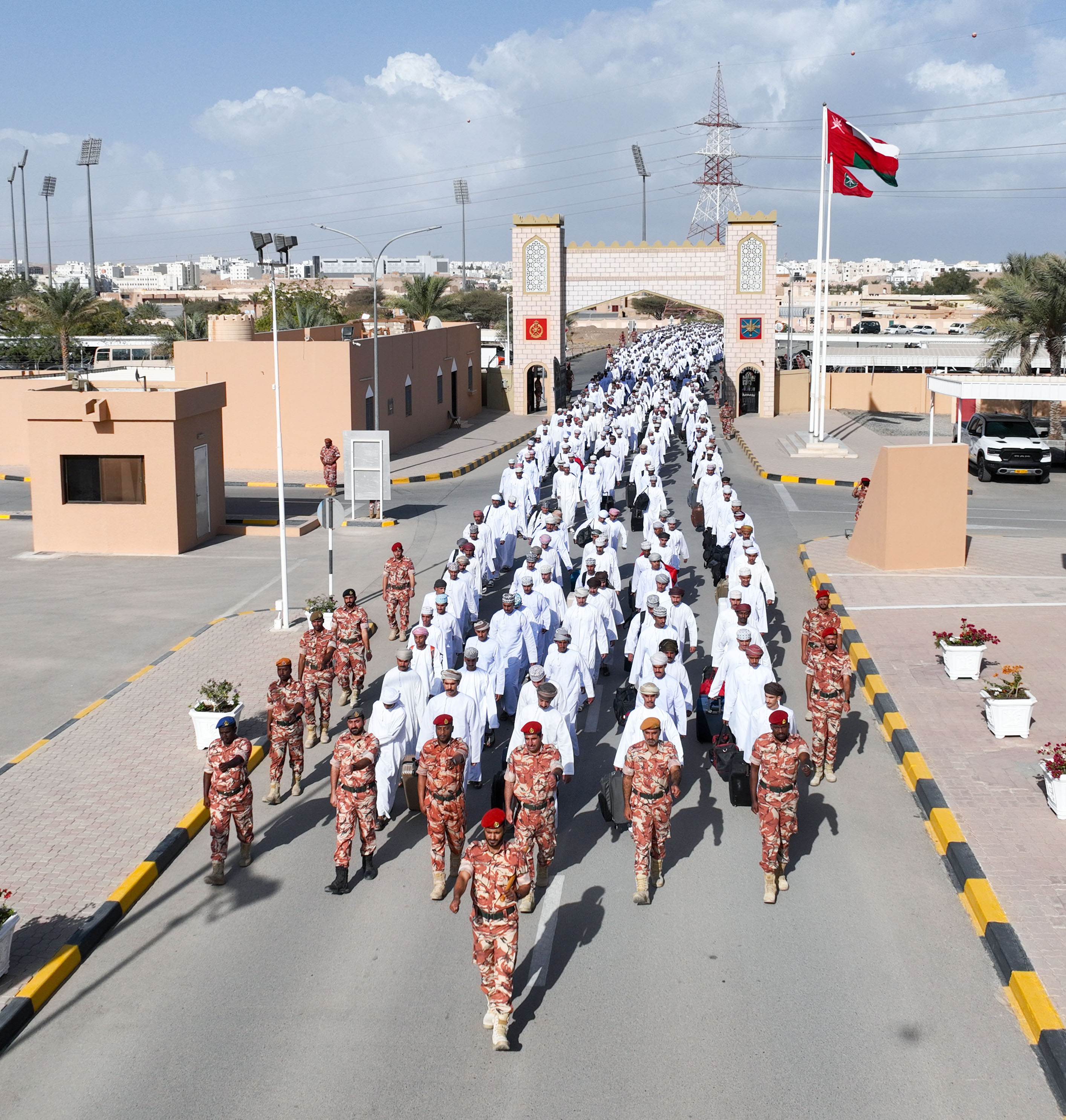استمرارا للجهود الوطنية التكاملية التي تقوم بها قوات السلطان المسلحة في استيعاب المواطنين وبالتنسيق مع وزارة العمل، استقبل الجيش السلطاني العماني اليوم دفعة جديدة من المواطنين (ذكور/ إناث) للتدريب العسكري والالتحاق بوحداته، حيث سيخضع المتدربون لبرنامج التدريب العسكري الأساسي جنوداً مستجدين والانضمام إلى ميادين الشرف والواجب الوطني، وذلك بعد أن اجتازوا مراحل القبول والتقييم والاختبارات والفحوصات الطبية والبدنية التي أجريت لهم مسبقًا.