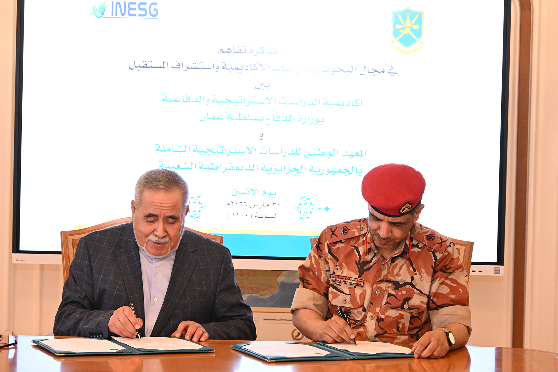 وقع مذكرة التفاهم عن الأكاديمية اللواء الركن حامد بن أحمد سكرون رئيس أكاديمية الدراسات الإستراتيجية والدفاعية، فيما وقعها عن المعهد السيد عبد العزيز مجاهد المدير العام للمعهد الوطني للدراسات الإستراتيجية الشاملة.
